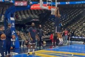 > 40岁还能飞!灯泡连线!赛前热身哈登助攻保罗空接暴扣!