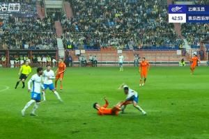 > 这下太痛了!第43分钟,宋浩宇防守时被倒地的罗竞踢到裆部!